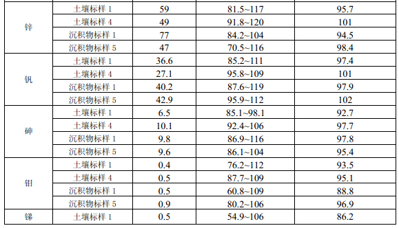 11.4 每批次樣品至少分析 10% 的加標(biāo)回收樣,樣品數(shù)量小于 10 個時,應(yīng)至少做一個加標(biāo) 回收樣。加標(biāo)回收樣測定結(jié)果中,電熱板消解測定鎘(Cd)、鈷(Co)、銅(Cu)、鉻(Cr)、 錳(Mn)、鎳(Ni )、鉛(Pb)、鋅(Zn)、釩(V)、砷(As)的加標(biāo)回收率應(yīng)控制在 70% ~ 125%之間,鉬(Mo)、銻(Sb)的加標(biāo)回收率應(yīng)控制在 50% ~125%之間;微波消解測定 12 種金屬元素的加標(biāo)回收率應(yīng)控制在70% ~125%之間。