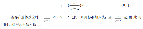 測定待測試樣的吸光度為A,從校準(zhǔn)曲線上查得濃度為x。再向待測試樣中加入標(biāo)準(zhǔn)溶液,加標(biāo)濃度為s,測定其吸光度為B,從校準(zhǔn)曲線上查得濃度為y。按照公式(B.1)計算待測試樣的濃度c: