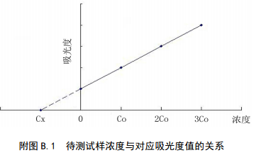 分別量取4等份量待測試樣(濃度為Cx),配制總體積相同的4份溶液。第一份不加標準溶液,第二、三、四份分別按比例加入不同濃度的標準溶液,4份溶液的濃度分別為:Cx、Cx+Co、Cx+2Co、Cx+3Co,加入標準的最小濃度Co≈0.5Cx。用空白溶液調零,在相同條件下依次測定4份溶液的吸光度值。以吸光度值為縱坐標,加入標準溶液的濃度為橫坐標,繪制校準曲線,曲線反向延伸與橫坐標的交點即為待測樣品的濃度。該方法只適用于濃度和吸光值呈線性的區(qū)域。待測試樣濃度與對應吸光度值的關系見附圖A.1。