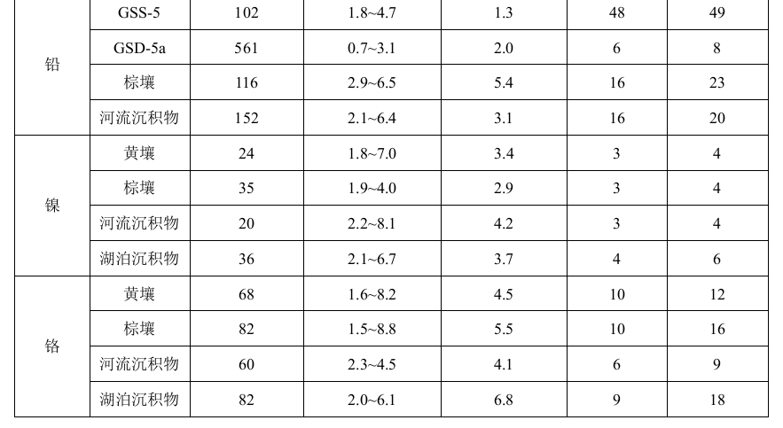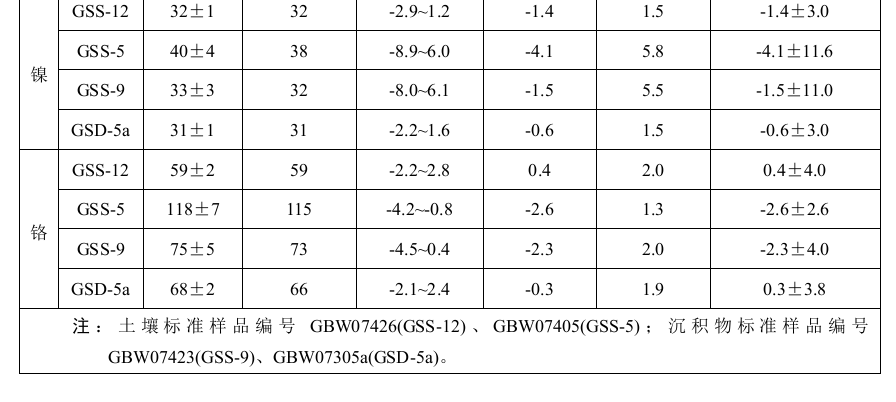 六家實驗室分別對有證標準樣品GSS-5和GSD-5a中的鉛進行了6次重復(fù)測定:相對誤差范圍分別為-0.5%~3.0%和-1.9%~2.9%;相對誤差最終值分別為1.7%±2.8%和 0.3%±4.2%。 六家實驗室分別對有證標準樣品GSS-12、GSS-5、GSS-9和GSD-5a中的鎳進行了6次重復(fù)測定:相對誤差范圍分別為-2.9%~1.2%、-8.9%~6.0%、-8.0%~6.1%和-2.2%~1.6%;相對誤差最終值分別為-1.4%±3.0%、-4.1%±11.6%、-1.5%±11.0%和-0.6%±3.0%。 六家實驗室分別對有證標準樣品GSS-12、GSS-5、GSS-9和GSD-5a中的鉻進行了6次重復(fù)測定:相對誤差范圍分別為-2.2%~2.8%、-4.2%~-0.8%、-4.5%~0.4%和-2.1%~2.4%;相對誤差最終值分別為0.4%±4.0%、-2.6%±2.6%、-2.3%±4.0%和0.3%±3.8%。