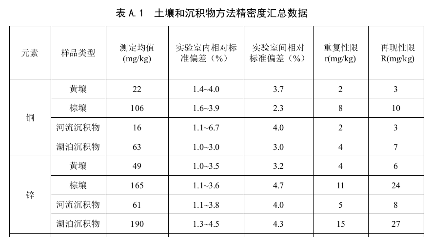 家實驗室對不同類型的土壤和沉積物統(tǒng)一樣品進行了測定,方法的重復(fù)性和再現(xiàn)性等精密度數(shù)據(jù)見表A.1。