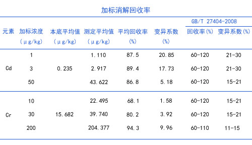本試驗(yàn)采用的石墨消解儀硝酸濕法消解方式,僅需1次前處理方法,可以同時(shí)檢測鎘、鉻、2種重金屬元素,操作簡 便,試劑耗材消耗量少,節(jié)約了成本,石墨消解儀具有批處理量大且無需實(shí)驗(yàn)人員值守的優(yōu)點(diǎn),安全性系數(shù)高,一 般性實(shí)驗(yàn)室均可采用。