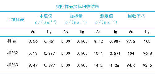對3份實際土壤樣品加標,結(jié)果見下表。由表中可知,全自動石墨消解法處理樣品,砷和汞的加標回收率分別為94.6%~104%和92.6%~105%。試驗說明,該方法測定土壤中的砷和汞,準確度和精密度均能滿足質(zhì)量控制的要求。