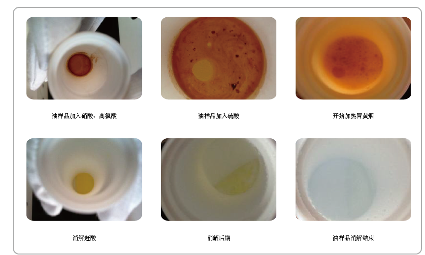 智能消解儀上進行濕法消解,各類油脂消解可在1天內(nèi)完成。儀器將劇烈的實驗反應變成可控狀態(tài):儀器自動加入三種濃酸,樣品混勻,低溫冷消,浸泡過夜自動開啟,之后再自動程序升至高溫消解,在樣品回復室溫后完成定容,全部實現(xiàn)自動化,增加了樣品消解的成功率,避免了人員的危險,提高了實驗效率。