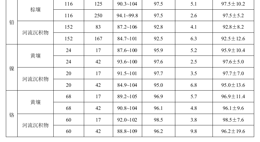 本標準適用于土壤和沉積物中銅、鋅、鉛、鎳和鉻的測定。當取樣量為0.2g、消解后定容體積為25 ml時,銅、鋅、鉛、鎳和鉻的方法檢出限分別為1 mg/kg、1 mg/kg、10 mg/kg、3 mg/kg和4 mg/kg,測定下限分別為4 mg/kg、4 mg/kg、 40 mg/kg、12 mg/kg和16 mg/kg。