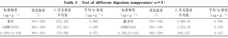 準確稱取2.0g(精確至0.0001g)植物標樣茶葉(GBW10016)樣品和灌木葉(GSB07602)樣品各15份,分3組,每組5次重復(fù)稱樣,以2.2中HNO3+HClO4(V+V)(8+2)mL混酸比溶液進行消化處理,再以不同的消解溫度進行消化處理,測試硒的相對熒光值,結(jié)果見表3。