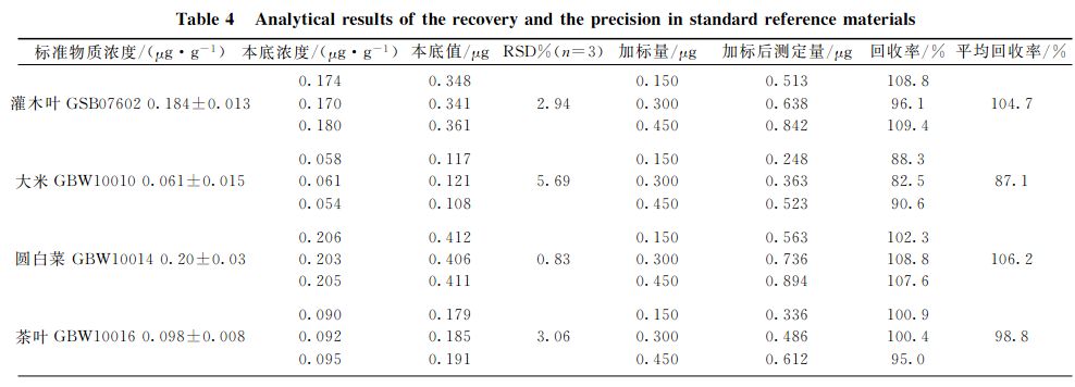 分別選取灌木葉、大米、圓白菜、茶葉和柑橘葉五種植物標準樣品,每種重復(fù)3次準確稱取2.0g(精確至0.0001g),按上述實驗條件進行消解,測定本底值。再對每種植物標樣稱取子樣,每種重復(fù)3次準確稱取2.0g(精確至0.0001g),此次每種試樣中分別加入1.0mg?L-1硒標準溶液150,300,450gL,進行消解并測定加標后值,同時測定硒質(zhì)控環(huán)境標準溶液(GSBZ50031-94(203710)),結(jié)果見表4??梢?硒標準加標回收率在87.1%~106.2%之間,精密度(n=3)在0.83%~5.69%之間,所測結(jié)果均與標準物質(zhì)的參考值吻合,完全達到分析要求。