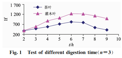 準確稱取2.0g(精確至0.0001g)植物標樣茶葉(GBW10016)樣品和灌木葉(GSB07602)樣品各24份,分8組,每組3次重復(fù)稱樣,以2.2中HNO3+HClO4(V+V)(8+2)mL混酸比溶液,以表3中的160~180C為消化溫度,分別設(shè)定8組消化時間為2,3,4,5,6,7,8,9h,測試硒的相對熒光值,結(jié)果見圖1。