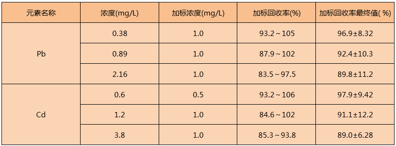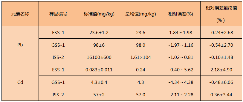 從表中得知,實(shí)驗(yàn)方法測定樣品的準(zhǔn)確度結(jié)果滿足實(shí)驗(yàn)要求,該方法適用于固體廢物的消解。