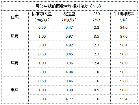 選取綠豆、眉豆、黑豆進(jìn)行精密度和準(zhǔn)確度試驗,每種豆類各添加0.50、1.00、 5.00 mg/kg的鍶溶液進(jìn)行加標(biāo)回收實驗,每個加標(biāo)水平取6個平行樣,結(jié)果見表。由表可以看出,平均回收率在90.0~98.0 %之間,相對標(biāo)準(zhǔn)偏差(n=6)在0.9~3.5%之間,說明方法的精密度和準(zhǔn)確度良好,建立的測試方法能滿足豆中鍶元素的分析測定。