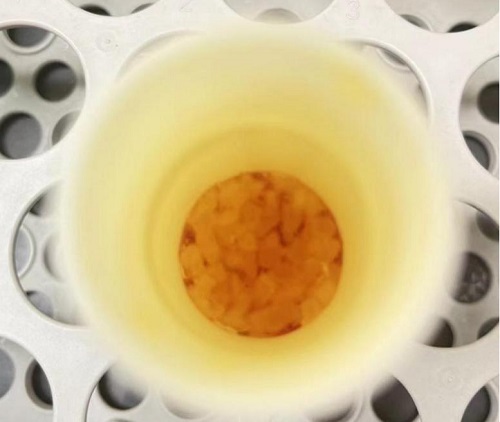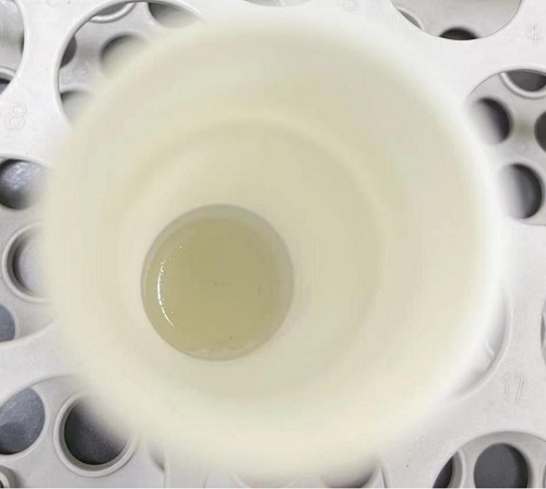 最終的試樣已基本消解完全,有極少量黑色不溶物顆粒(可能為硅膠內自帶物),試液呈淡黃色。
